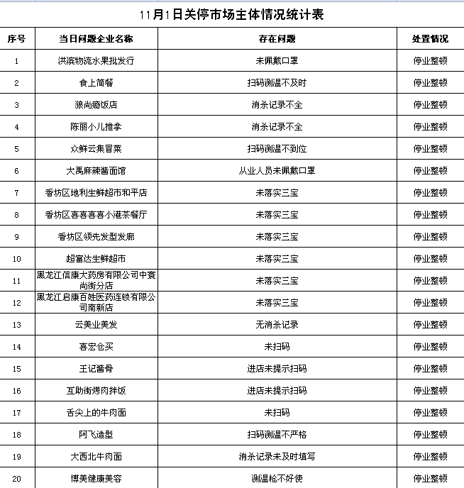 11月1日,哈爾濱市香坊區市場監督管理局、文旅局、商務局、農業農村局、衛健局、城管局、公安分局等部門組成的香坊區應對新型冠狀病毒感染肺炎疫情工作指揮部市場監管組對轄區內各市場主體疫情防控措施落實情況開展聯合督導檢查,35家市場主體因疫情防控不到位被關停。