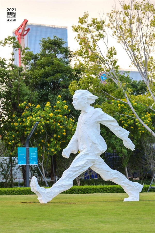 藝術家蘇新平的《行走的人》頗具時代潮流感與動感,作品呈現出的向前的趨勢和昂揚的姿態,這與深圳這個城市的精神品質形成呼應。作品形象鮮明的輪廓和強有力的步伐在深圳人才公園的背景下更與周圍行人形成呼應,由此形成與觀眾的共鳴。