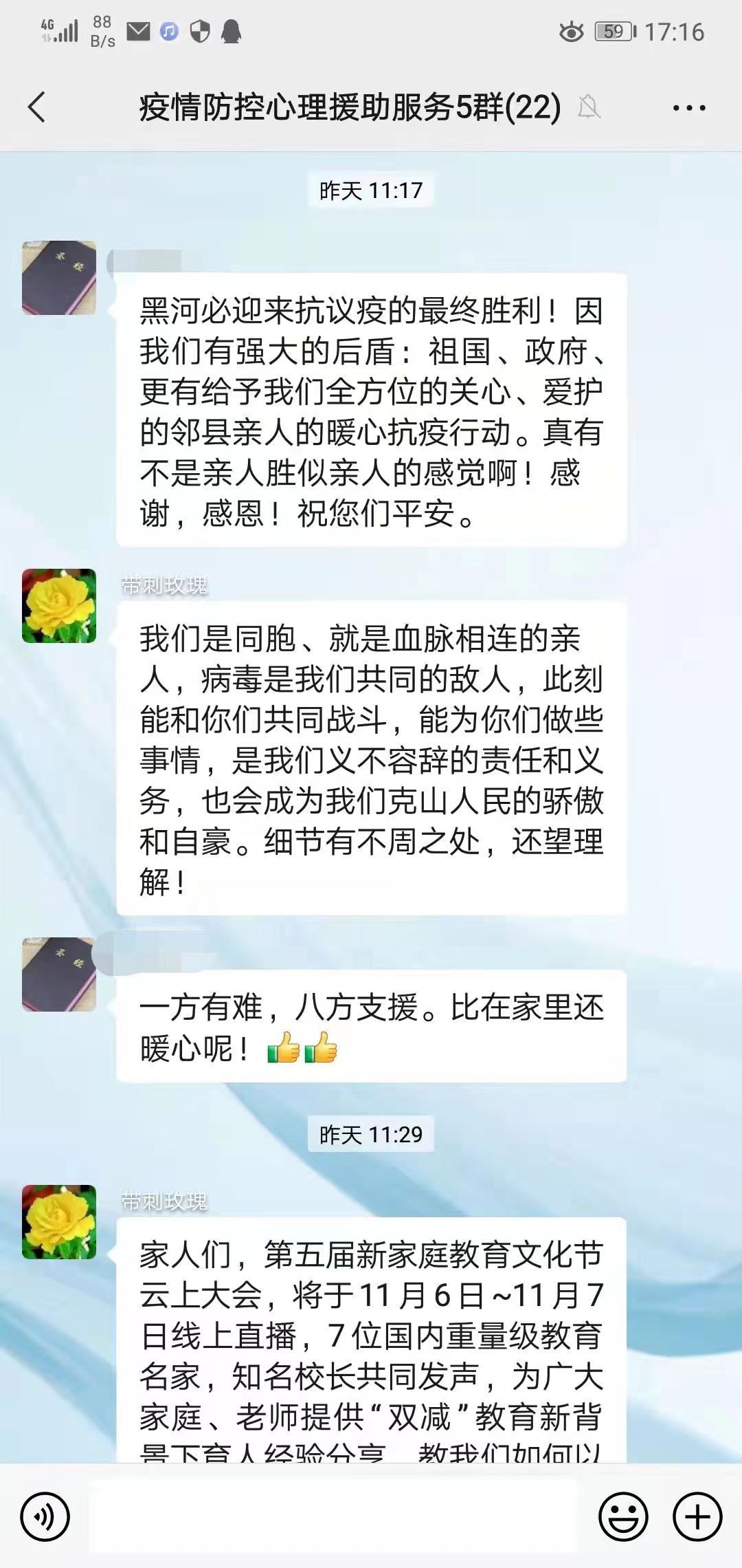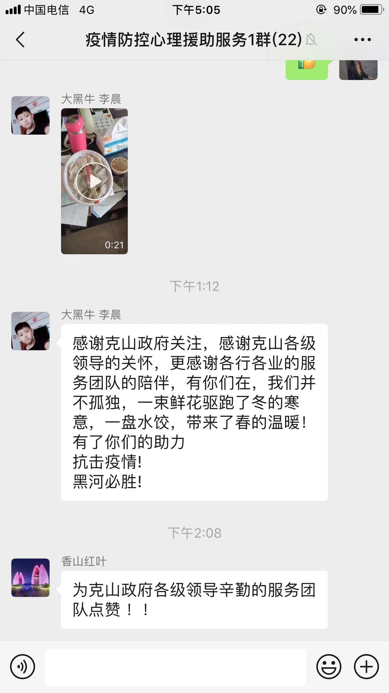 在服務上將克山縣人民對兄弟市縣的深情厚誼融匯到無微不至的服務中。飲食管理上,適當匹配水果、牛奶,做到葷素搭配、營養均衡;日常服務上,分類做好老人、兒童等不同群體個性化服務、人性化關懷,提供學習用品、常用藥等物品;精神鼓勵上,強化隔離人員心理疏導,建立隔離人員心理疏導微信群,發放《致黑河朋友的一封信》,安撫隔離期間焦躁情緒,確保隔離人員安心舒心。同時,各級領導先後召開視頻會議 3 次,為隔離點工作人員送去深切慰問和殷切囑託。