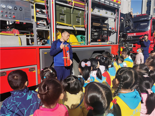 「小朋友們,你們知道這是什麼嗎?這是消防車裏面的發電機。這個雲台能升多高,你們猜一猜?……」該消防救援站二班班長盧等等耐心地跟小朋友們進行互動,用小朋友們喜歡的方式跟他們講解一些消防安全方面的知識。