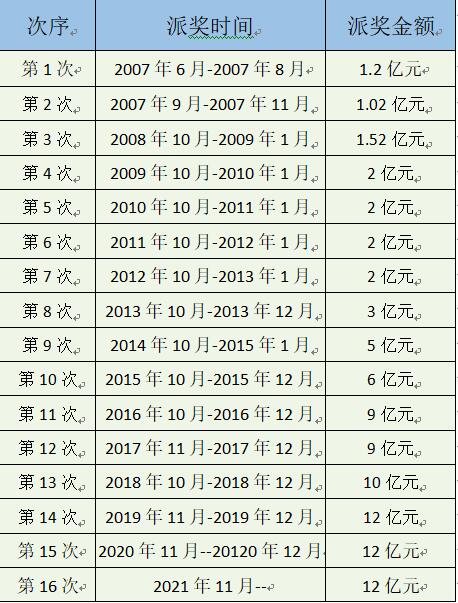 雙色球,為夢造福。據悉,上市以來,雙色球遊戲累計中出一等獎超20000注,中出1億元以上大獎33個。我國彩票市場每10個億元大獎中就有6個出自雙色球遊戲,排名前十名億元大獎中雙色球遊戲獨佔六席。本次派獎是雙色球的第16次派獎,將從雙色球第2021131期(開獎日期為2021年11月16日,星期二)開始,派獎總金額12億元,預計連續派獎20期。12億元的派獎總額也追平了雙色球遊戲派獎金額紀錄。