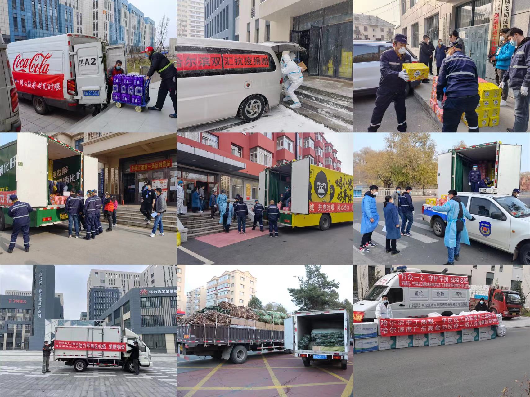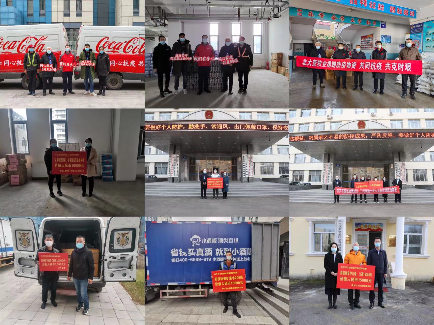 哈爾濱英才快餐食品有限公司、泉州商會、哈爾濱珍寶製藥有限公司、北大荒豆業、中糧可口可樂、八達集團、東鵬飲料(集團)股份有限公司、哈爾濱龍之潤科技有限公司、比優特商貿有限公司、黑龍江珍選食品有限公司、航天科技控股集團股份有限公司、哈爾濱雙匯北大荒食品有限公司、萬宇科技、金龍物流運輸有限公司、哈爾濱天海電子有限公司、黑龍江釜隆瑞鑫精工科技公司、哈爾濱實力航空工業有限公司、哈爾濱哈飛工業有限責任公司、哈爾濱東安進出口有限公司、哈爾濱東大高新材料股份有限公司、哈爾濱東盛金材科技股份有限公司、黑龍江太氏食品有限責任公司、哈爾濱中飛新技術股份有限公司、威瀚電氣、哈爾濱華春藥化環保技術開發有限公司、哈爾濱瀚霖科技開發有限公司、廣聯航空工業股份有限公司、對青烤鵝、哈爾濱人人好醫藥連鎖有限公司、哈爾濱聖昌科技開發有限公司、黑龍江龍江福糧油有限公司、北大荒牧業、紅海人力集團、哈爾濱小酒喔倉儲有限公司、哈爾濱龍濱實業有限公司、黑龍江鑫達企業集團有限公司、黑龍江省恒生幹細胞工程有限公司、哈爾濱艾瑞排放控制技術股份有限公司、哈爾濱健康醫藥連鎖有限公司、正陽家園、哈爾濱紅旗茂商業城有限責任公司、黑龍江煦航企業財稅管理諮詢有限公司、黑龍江正開律師事務所、黑龍江電力建設監理有限責任公司、哈爾濱頂益食品有限公司、黑龍江華宇置業有限公司、哈爾濱安宇迪航空公司、黑龍江王氏國信城網絡股份有限公司、哈爾濱老哈食品有限公司、哈爾濱深哈投資管理有限公司、黑龍江大三源乳品機械有限公司、哈爾濱秋林飲料科技股份有限公司、香港商報黑龍江辦事處等企業紛紛以捐款、捐物等形式助力疫情防控。