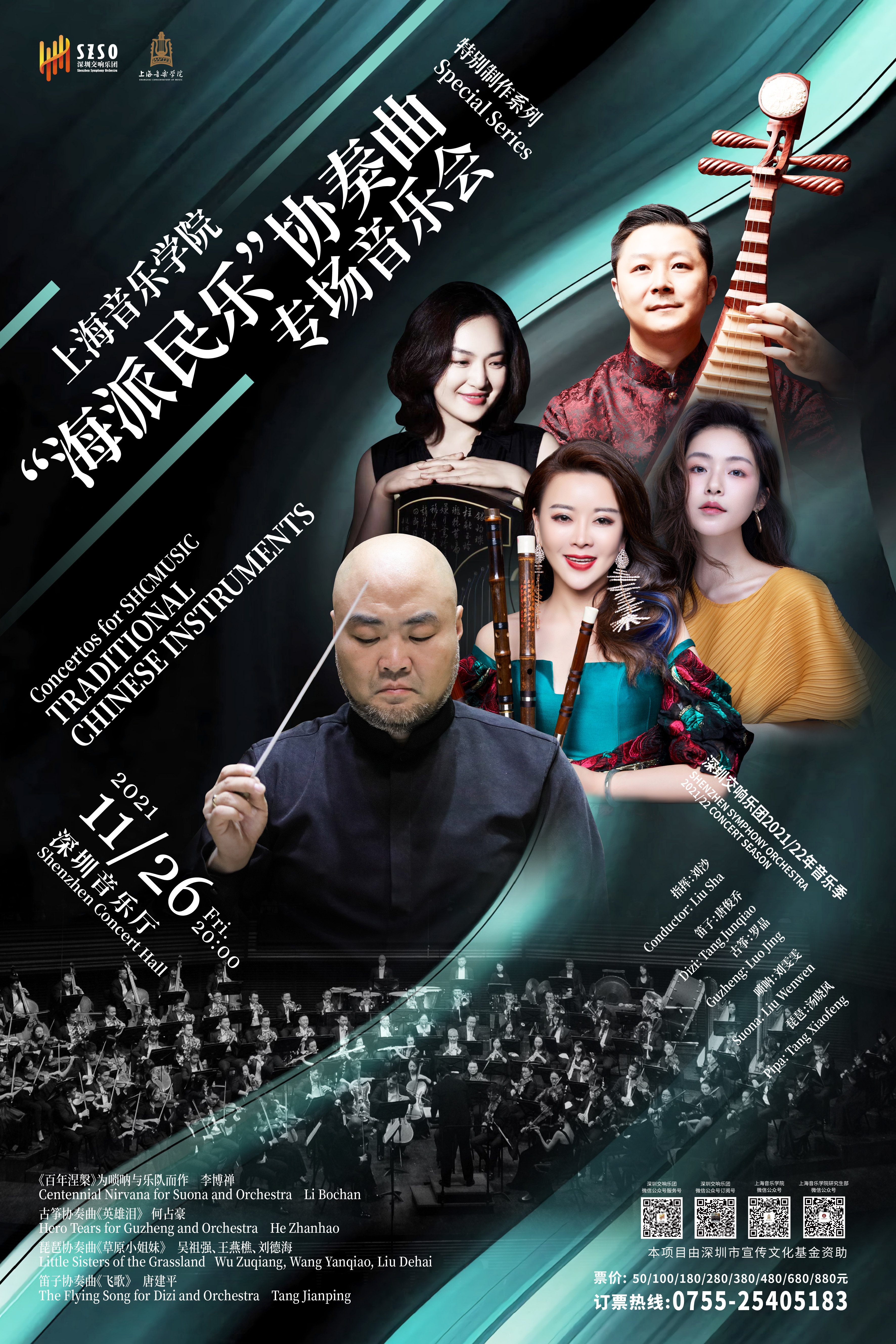 2021年11月26日周五晚8點,由指揮家劉沙執棒,深圳交響樂團攜手國內頂尖竹笛演奏家唐俊喬、著名古箏演奏家羅晶、著名琵琶演奏家湯曉風、著名青年嗩吶演奏家劉雯雯,在深圳音樂廳為廣大市民獻上一場「海派民樂」協奏曲音樂會。