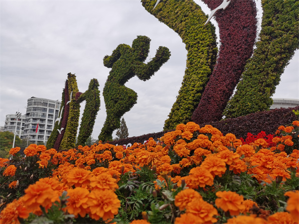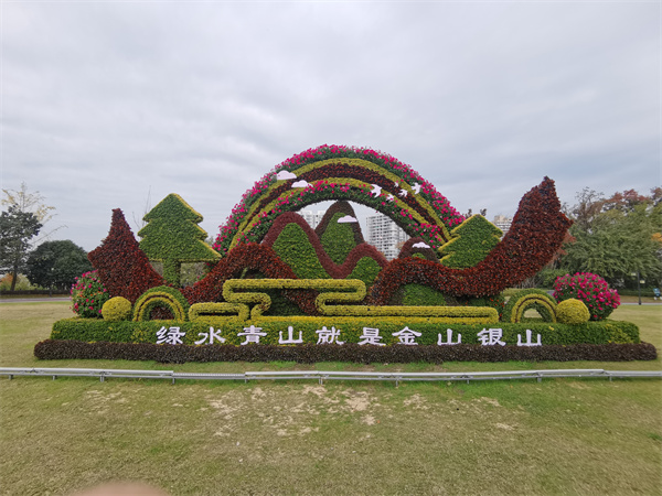 「南濱江這個綠雕,主題是綠水青山就是金山銀山,綠雕的主體主要有大型的彩虹,山體大型的飄帶、樹木、浮雲等等元素組成的,這次我們採用了三萬株,花卉和色彩結合起來。」章金花介紹。