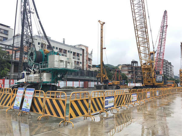 十一號線大金鐘站位於白雲區富悅街,車站全長232米,標準段寬為20.9米。自施工以來,車站受周邊環境複雜、地質條件差、出土困難等因素影響,廣州地鐵和施工單位中鐵一局的建設者們始終堅持「高標準、嚴要求、重效率」的工作理念。針對施工過程中可能存在的環保、噪音和施工時效等問題進行研判,提前制定具體的解決措施。在施工過程中,地鐵建設者們通過採用渣土二次轉運、「雙輪銑+沖樁機」組合施工、分層施工等措施,充分利用有效施工作業時間。同時,在確保工期可控的情況下,施工現場採用乾冰致裂工藝代替岩石爆破作業,盡最大限度地減少對周邊環境的影響。