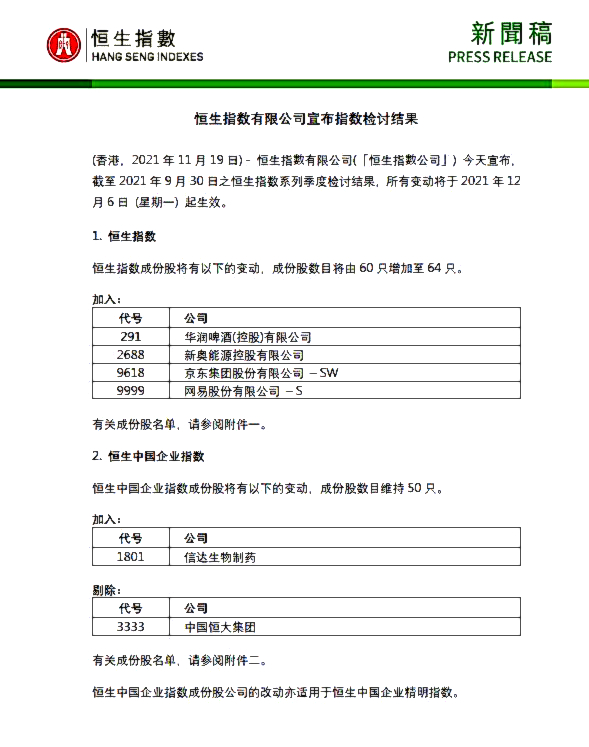 11月19日,恒生指數公司公佈季檢結果,恒生指數成份股將由60隻增加至64隻,新增的4家公司分別為:華潤啤酒(控股)有限公司(291)、新奧能源控股有限公司(2688)、京東集團股份有限公司(9618)、網易股份有限公司(9999);將信達生物製藥納入恒生中國企業指數,將中國恆大集團從恒生中國企業指數中剔除;恒生科技指數成份股未變,成份股數目維持30隻。