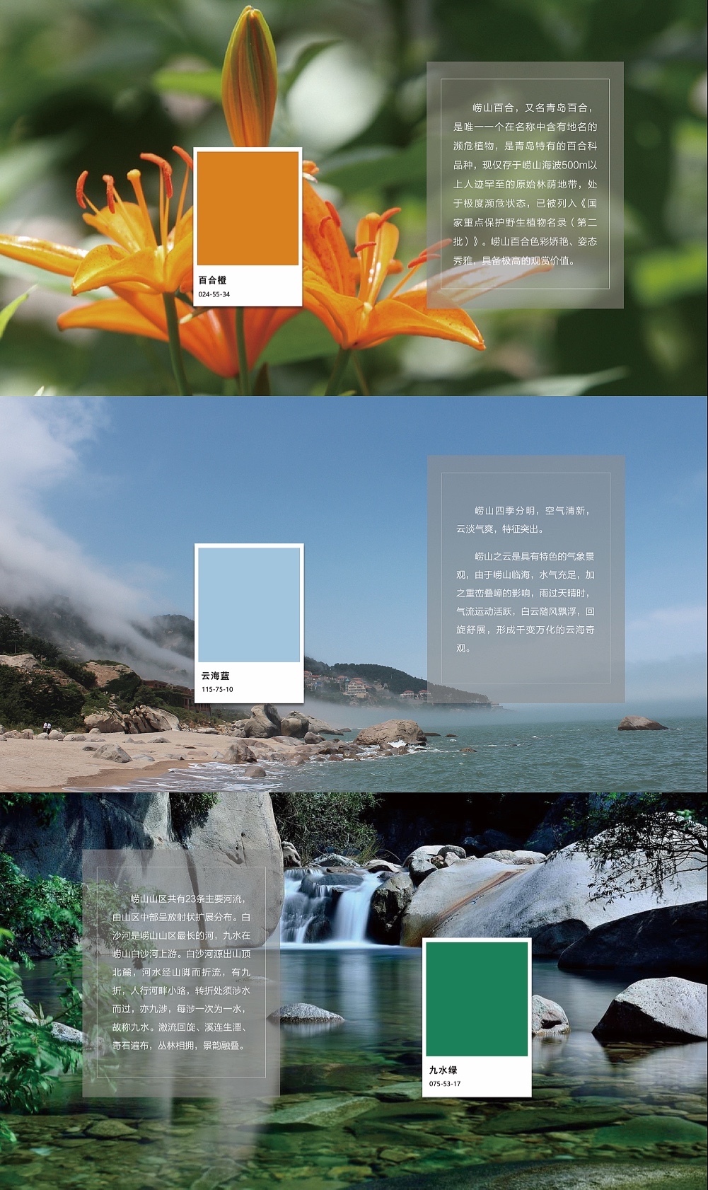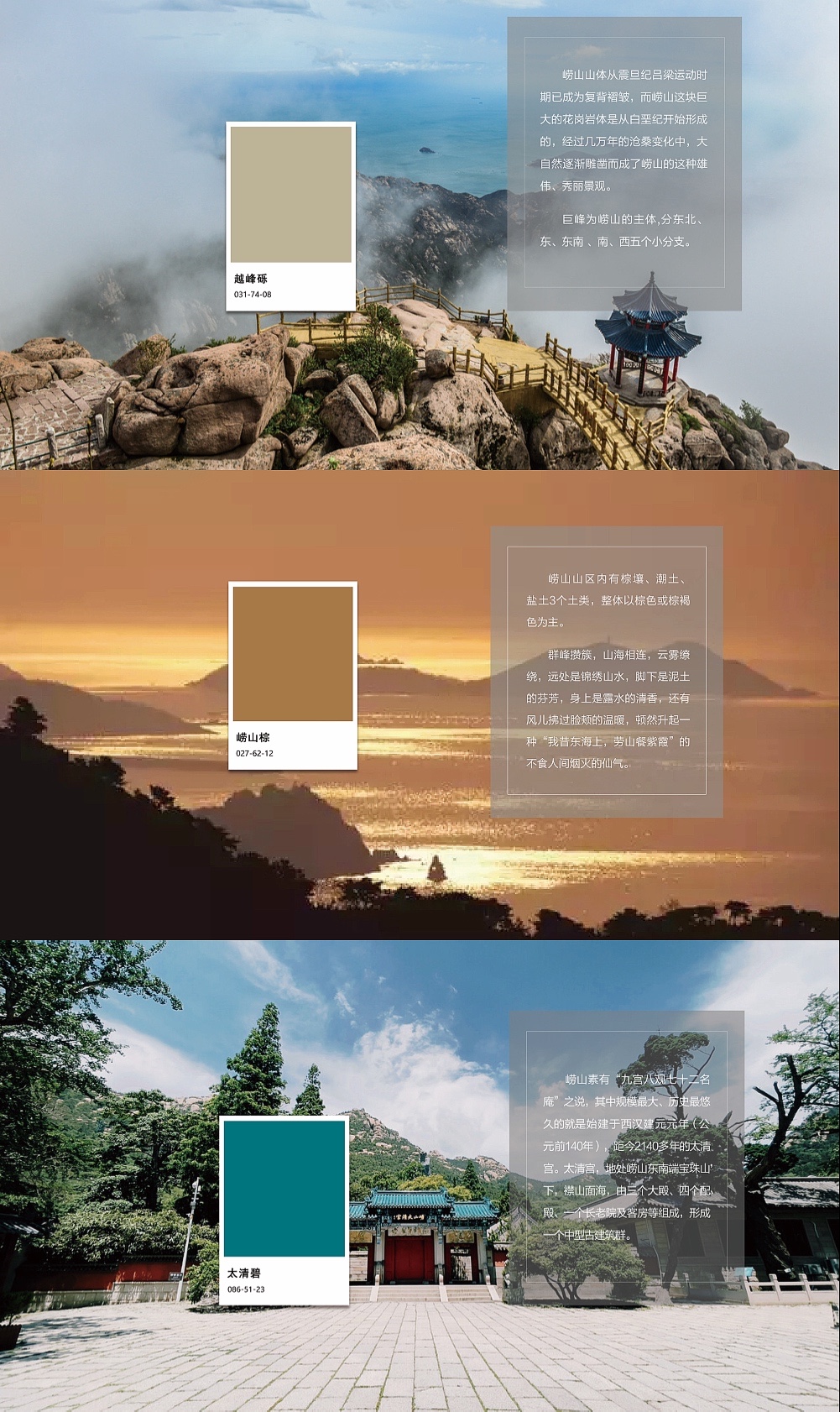 據介紹,為打造嶗山特有的區域品牌,基於對色彩規劃的需求,嶗山區委宣傳部委託北京普元文化藝術有限公司與青島普言文化有限公司,牽頭研究嶗山的地域基因色,編制了《青島嶗山地域基因色研究報告》。該研究報告由地域色彩研究的必要性與意義、城市基因色彩研究基礎、基因色適用範圍以及嶗山基因色挖掘和提取的過程幾個部分組成,從嶗山的自然環境色彩、古建色彩、現代建築色彩、文化色彩分別進行挖掘提煉,經專業比對、分析、測算,共提取20種嶗山色彩,最終以太清碧、百合橙、嶗山棕、雲海藍、九水綠及越峰礫作為嶗山核心基因色,並對基因色進行延展配色及應用建議。