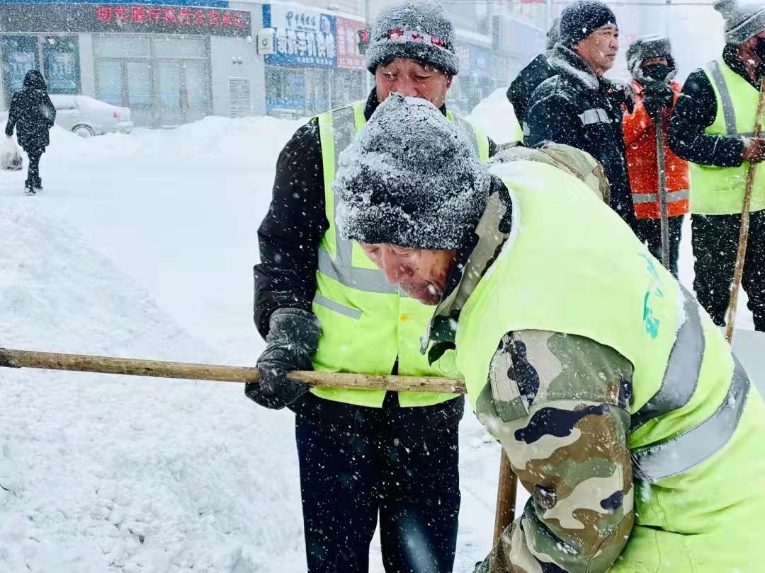 市容環境衛生服務中心環衛處副主任衣長海說:「我們環衛處以雪為令,共出動雪刷車10台、平地機3台、鏟車12台、清掃工人300餘人,到現在工人們沒有休息片刻。有的路段我們已經清理兩三遍了。現在仍在下雪,我們將繼續克服強降雪天氣的不利影響,持續進行清雪作業,全力保障道路暢通及群眾出行安全。」