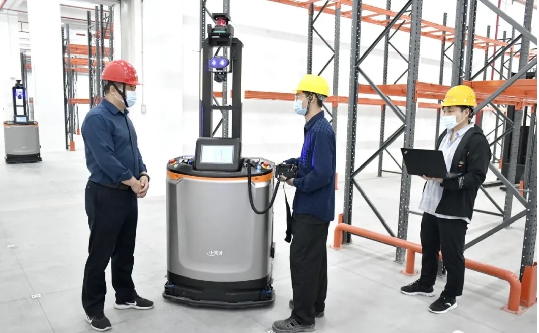 記者走進小天才1號廠房材料倉庫,看到這裏的貨架已經搭建起來,兩輛自動導引運輸車來回穿梭,專業技術員正在現場調試運輸車沿規定的導引路逕行駛和作業。