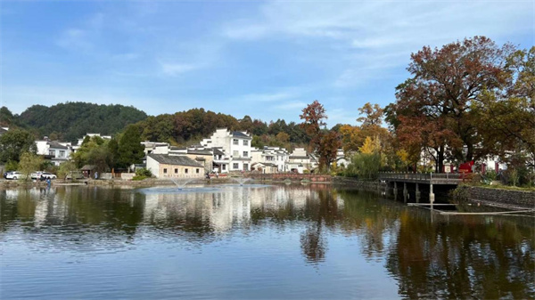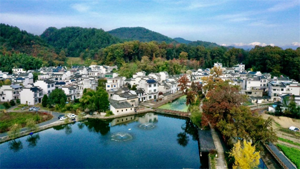 立冬後,皖南地區風景宜人,美不勝收。11月24日,在徽州區西溪南鎮琶塘村五彩斑斕的秋葉與皖南古村落遙相輝映,宛如一幅幅美麗的畫卷。