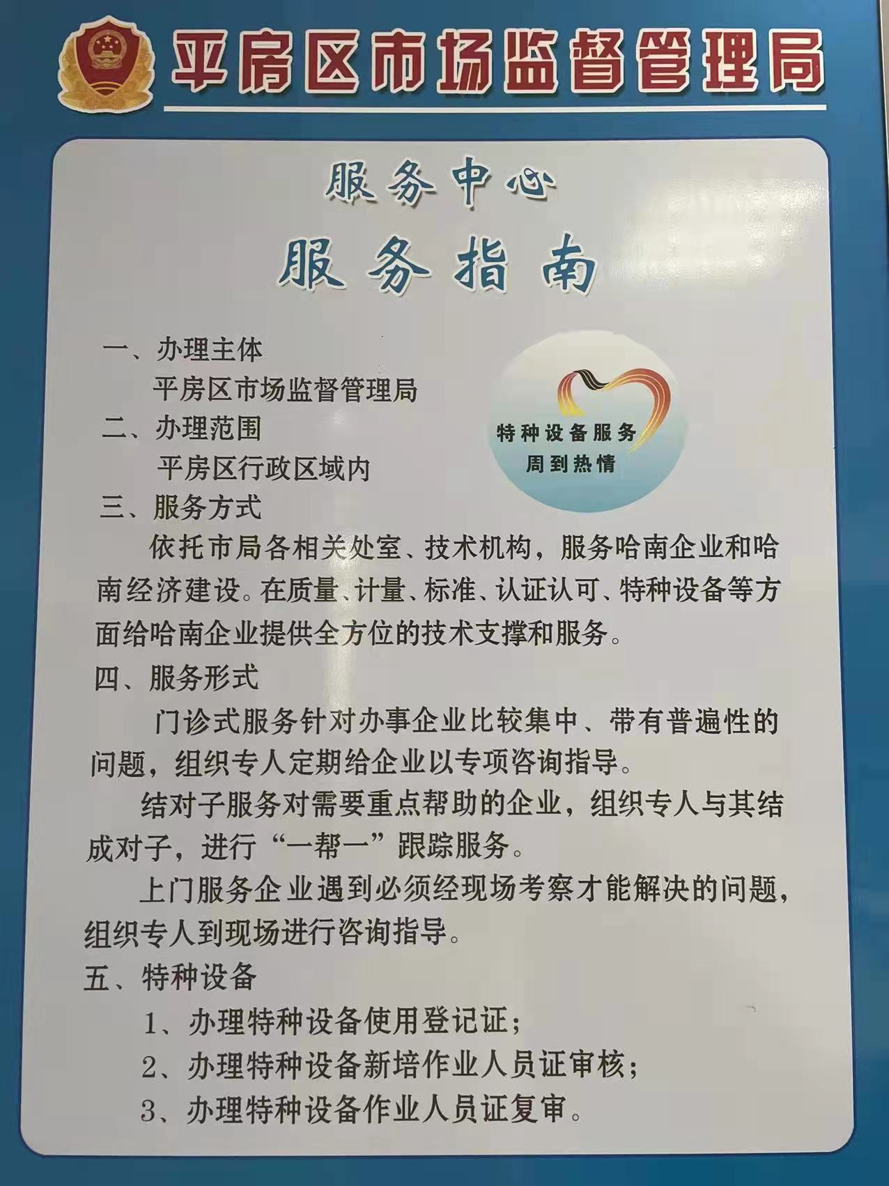 2021年,平房區市場局通過特種設備企業服務平台以「不見面、零跑腿」方式,共接受企業特種設備安裝、改造、修理施工告知367件,無一延誤和差錯。線下做到三個以下立等可取,為企業當場辦理髮證,並根據企業需求提供免費塑封服務,並及時建立企業檔案。