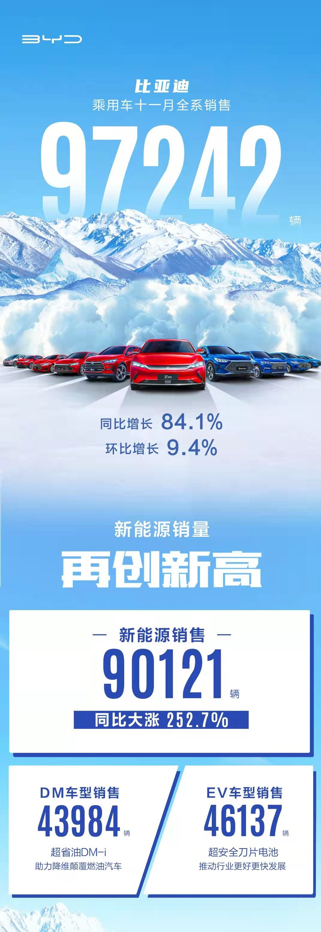 12月3日,比亞迪發佈旗下乘用車11月銷量快報。報告顯示,當月比亞迪乘用車全系銷售97242輛,同比增長84.1%。其中,新能源銷量同比暴漲252.7%、達90121輛。這也是截至目前中國新能源乘用車月銷新紀錄,至此,比亞迪2021年度累計銷量達500922輛。