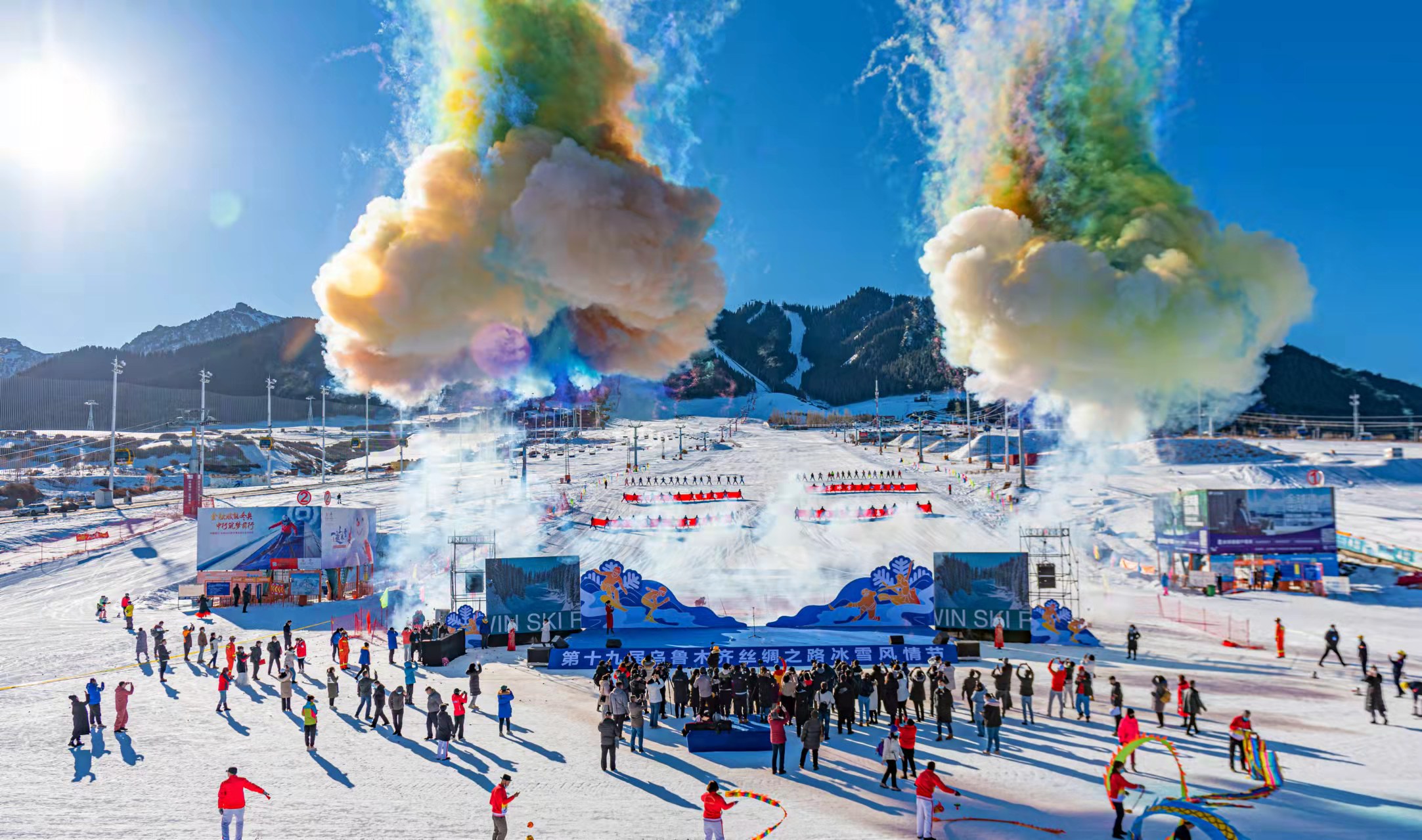 當日,「相約冬奧·冰雪疆來」第十九屆烏魯木齊絲綢之路冰雪風情節開幕式和「驕陽看雪 烏魯木齊」詩音畫烏魯木齊文旅活動在絲綢之路國際度假區正式奏響。