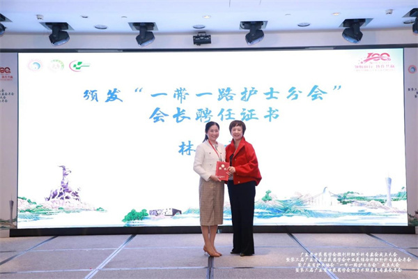 大會上,廣東省護士協會「一帶一路護士分會」選舉出會長、副會長、秘書長。選舉林麗君為分會首屆會長,鄧敏娉、唐少玲、何桂蘭等15位為副會長,廣東省中醫院胡燕嬌為秘書長兼常委,由陳偉菊會長頒發聘任證書。