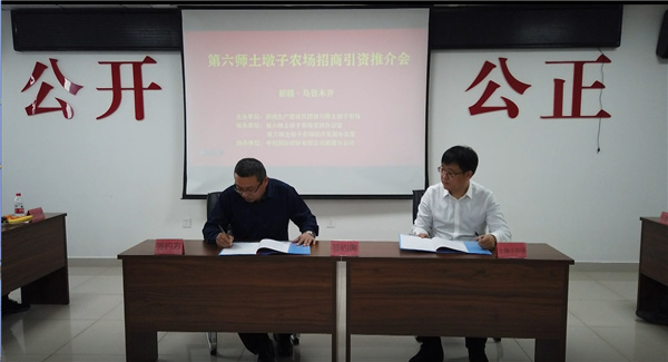 首先第六師土墩子農場黨委書記、政委昝淑然致歡迎辭並作主旨推介,第六師土墩子農場黨委常委、副場長馬世偉作農場招商引資情況介紹,第六師土墩子農場黨委常委、副場長王永明進行與新進兩家企業簽約儀式。