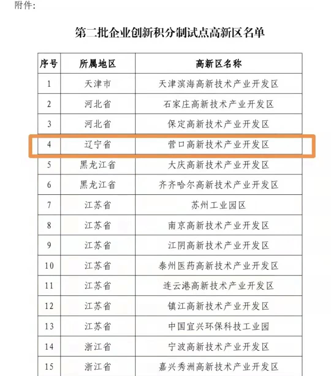 記者從遼寧營口自貿片區獲悉,近日,科技部火炬中心公佈國家高新區第二批企業創新積分制試點單位,營口高新區入選,是此次遼寧省唯一獲批的高新區,也是繼大連高新區後遼寧省獲批的第二家試點單位。標誌着營口高新區在統籌精準施策、培育壯大新動能、激發創新驅動力等方面邁上了新台階。