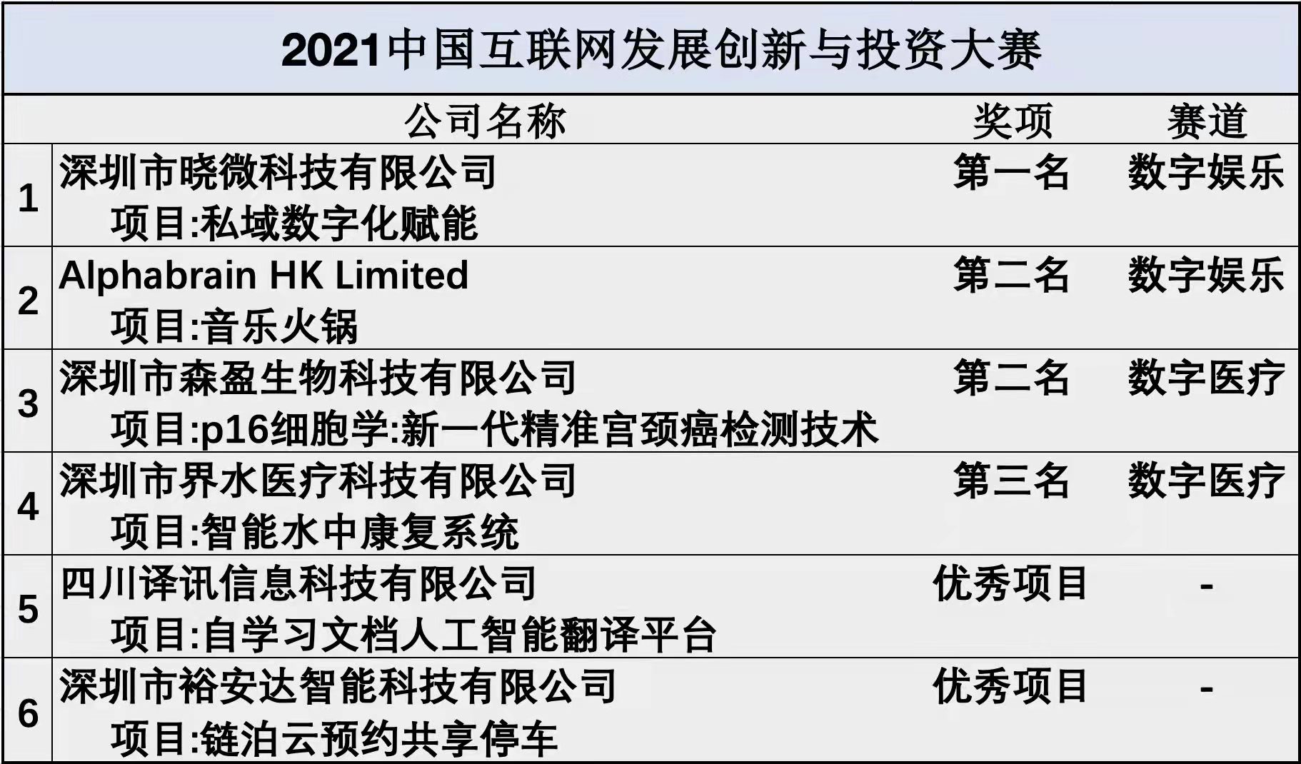 粵港澳大灣區創新智庫參賽團隊得獎企業分別是數字娛樂賽道第一名的深圳市曉微科技有限公司、第二名的香港Alphabrain HK Limited,數字醫療賽道第二名的深圳市森盈生物科技有限公司,第三名 深圳市界水醫療科技有限公司,以及優秀專案深圳市裕安達智能科技有限公司和四川譯訊資訊科技有限公司。