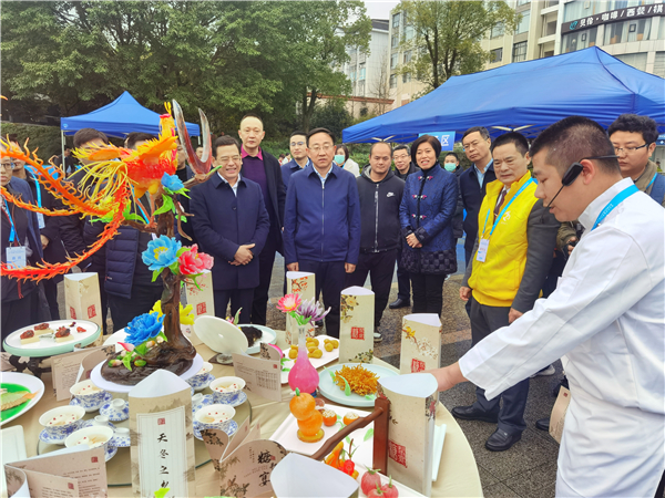 在中式烹調比賽現場,菜色豐富、擺盤精緻的「潼南檸檬養生有機蔬菜宴」,令人垂涎。潼南參賽選手王文彬告訴記者,宴席共有12道菜,包括8道熱菜、2道涼菜和2道小吃,主要以潼南檸檬、有機蔬菜為原材料,與潼南特色農業產業發展相結合,凸顯綠色、康養等亮點。