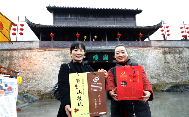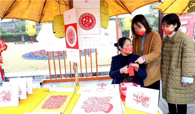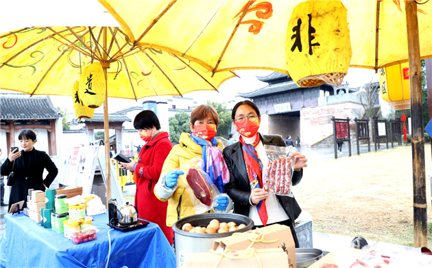 12月12日,安徽歙縣徽城鎮府衙廣場,歙縣女企業家協會會員在展示“非遺年貨”。