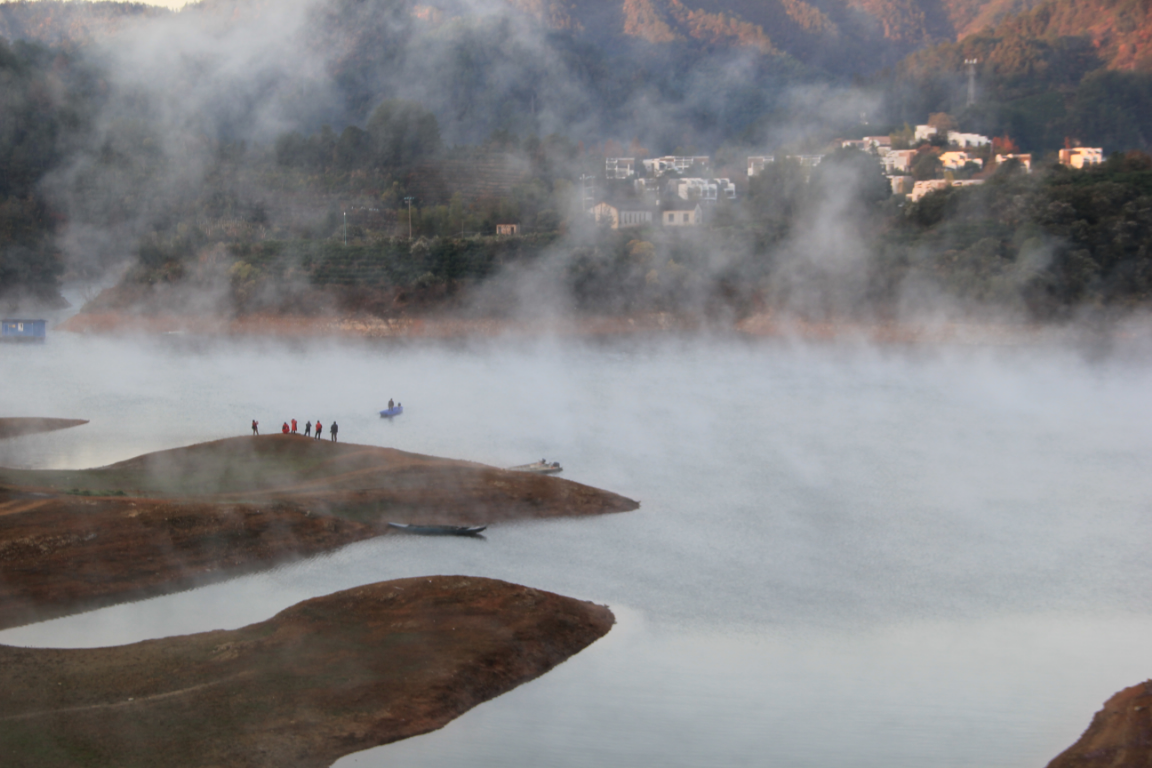 清晨,冬日的容溪從曉霧中醒來,晨風抖擻,一縷陽光溫柔的掀起霧帷,仿佛仙人浣紗,迷蒙縹緲。