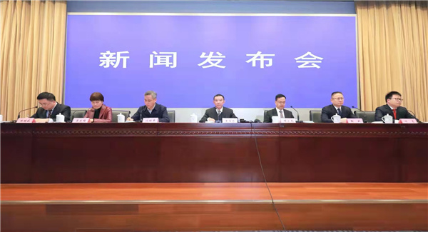 安徽省高速公路發展及「縣縣通高速」情況新聞發佈會現場,左起:安徽省委宣傳部副部長、省政府新聞辦主任鄭明武主持發佈會,旌德縣人民政府縣長吳忠梅,固鎮縣人民政府縣長沈明舉,省交通運輸廳一級巡視員章後忠,省交控集團董事長項小龍,石台縣人民政府縣長靳武,涇縣人民政府副縣長葉亮,先後介紹有關情況並回答記者提問(孫軍/攝)