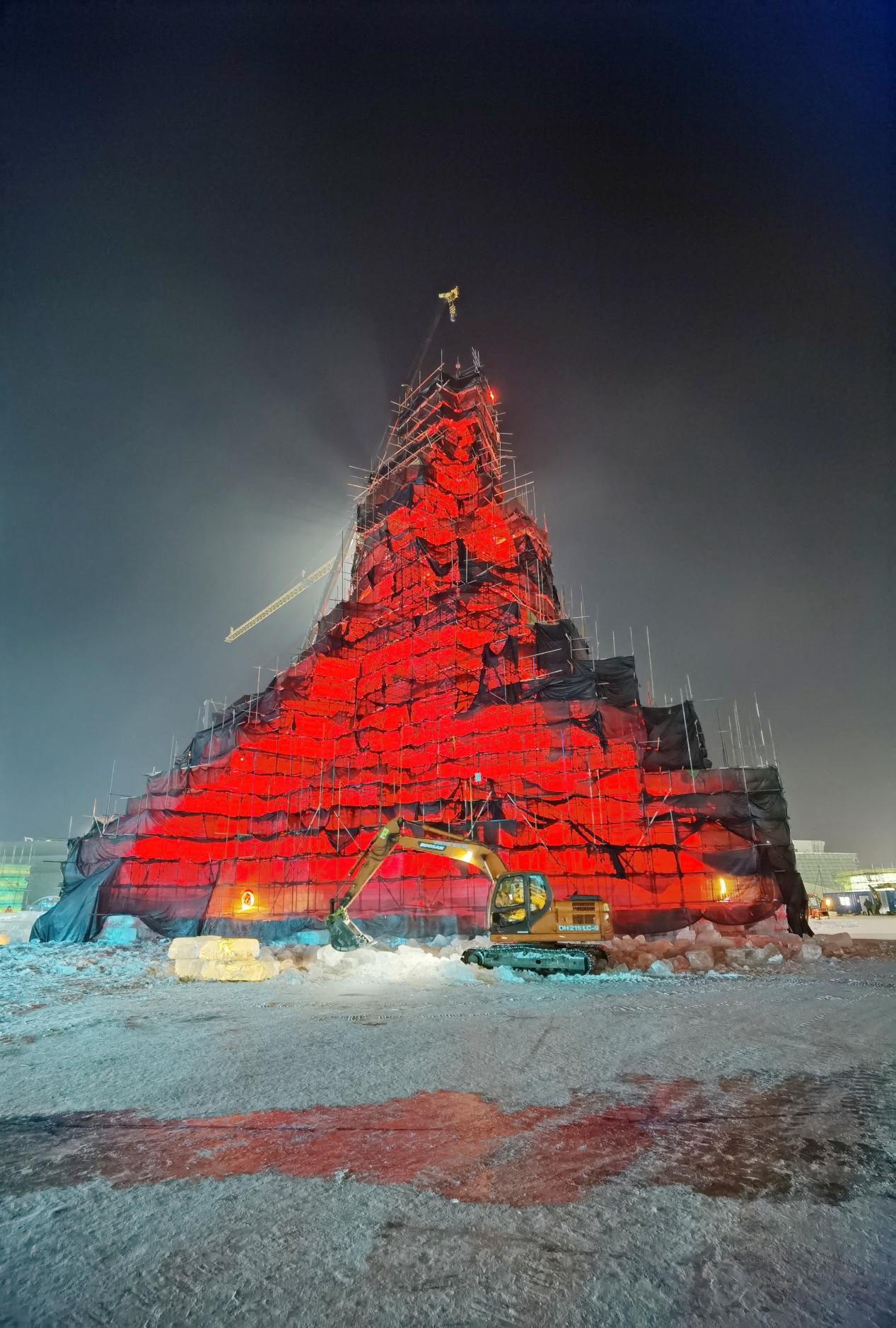 12月18日晚11時17分,第二十三屆哈爾濱冰雪大世界園區主塔「聖火之巔」搭建上最後一塊冰。這標誌着主塔的封頂工作正式完成,「聖火之巔」已進入最後的細節打磨和燈光調試階段。