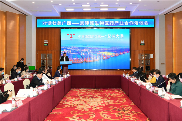 在對話壯美廣西——京津冀生物醫藥產業合作洽談會現場,北京伽拓醫藥研究有限公司、是光恒生(北京)生物醫藥科技有限公司等50多家「三類500強」、行業領軍企業參會。洽談會就防城港國際醫學開放試驗區發展規劃與投資機會作專題推介。