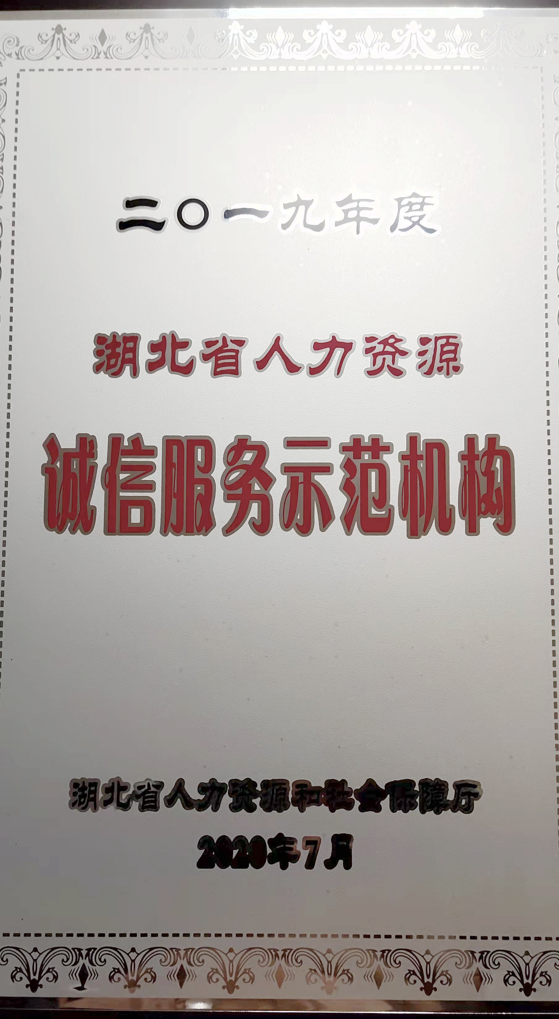 該企業獲頒「湖北省人力資源誠信服務示範機構」 牌匾