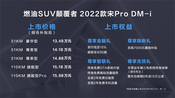12月22日,2022款宋Pro DM-i正式上市,官方指導價(綜合補貼後)13.48萬元—15.98萬元。定位「燃油SUV顛覆者」,2022款宋Pro DM-i帶來五大煥新——新動力、新外觀、新內飾、新智能、新操控,不僅滿足了中國家庭用戶對一台SUV的所有期待,也重新定義了15萬級SUV的新價值。