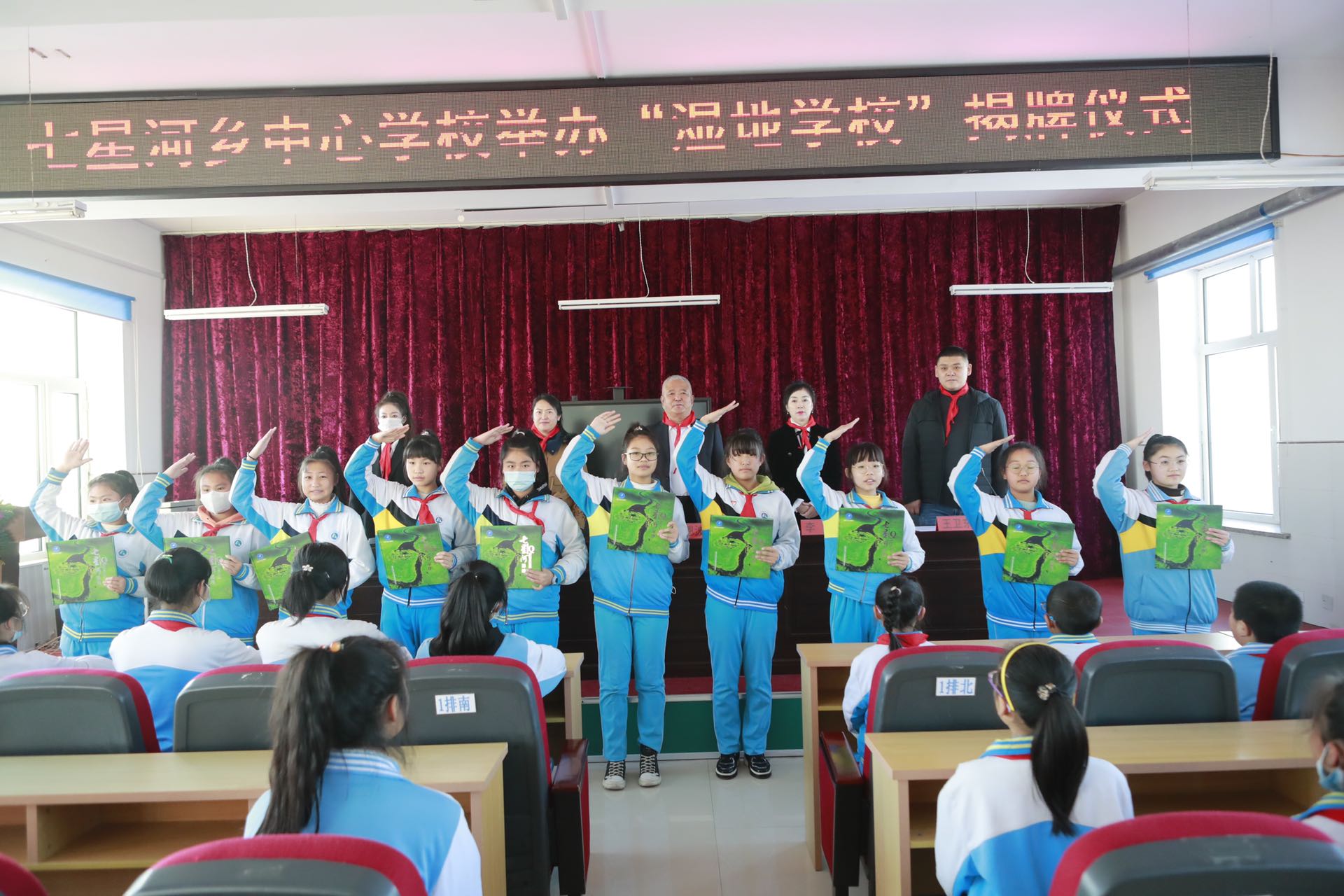 儀式上,七星河保護區管理局為七星河鄉中心學校頒發了「濕地學校」證書,並為學生們贈送了科普圖書和鳥類圖冊。