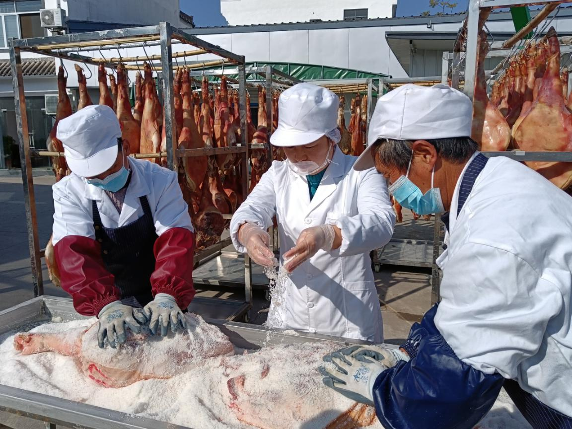 立冬過後,皖南地區開始醃火腿、灌香腸,備足年貨。連日來,黃山市徽州區容溪村村民胡慧娟家迎來了一年中最繁忙的銷售旺季,全家都在趕制火腿,滿足市場需求。