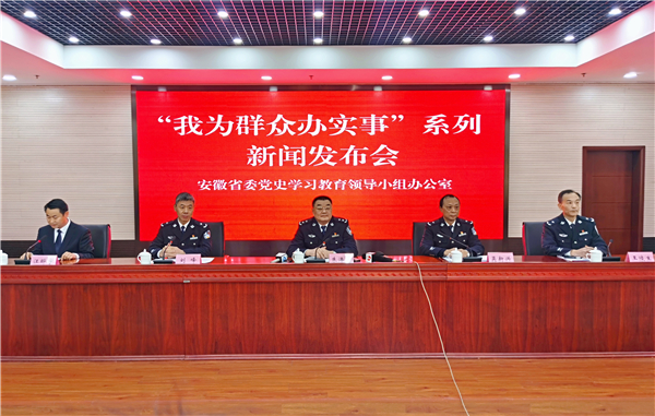 黨史學習教育「我為群眾辦實事」系列發佈會第四場,推進平安安徽建設 優化皖警便民服務發佈會現場,左起:安徽省委宣傳部新聞發佈處處長汪曄宇主持發佈會,省公安廳刑警總隊政委劉峰,省公安廳一級巡視員朱潘傑,省公安廳治安總隊政委吳新興,省公安廳交警總隊政委王陵生(孫軍/攝)