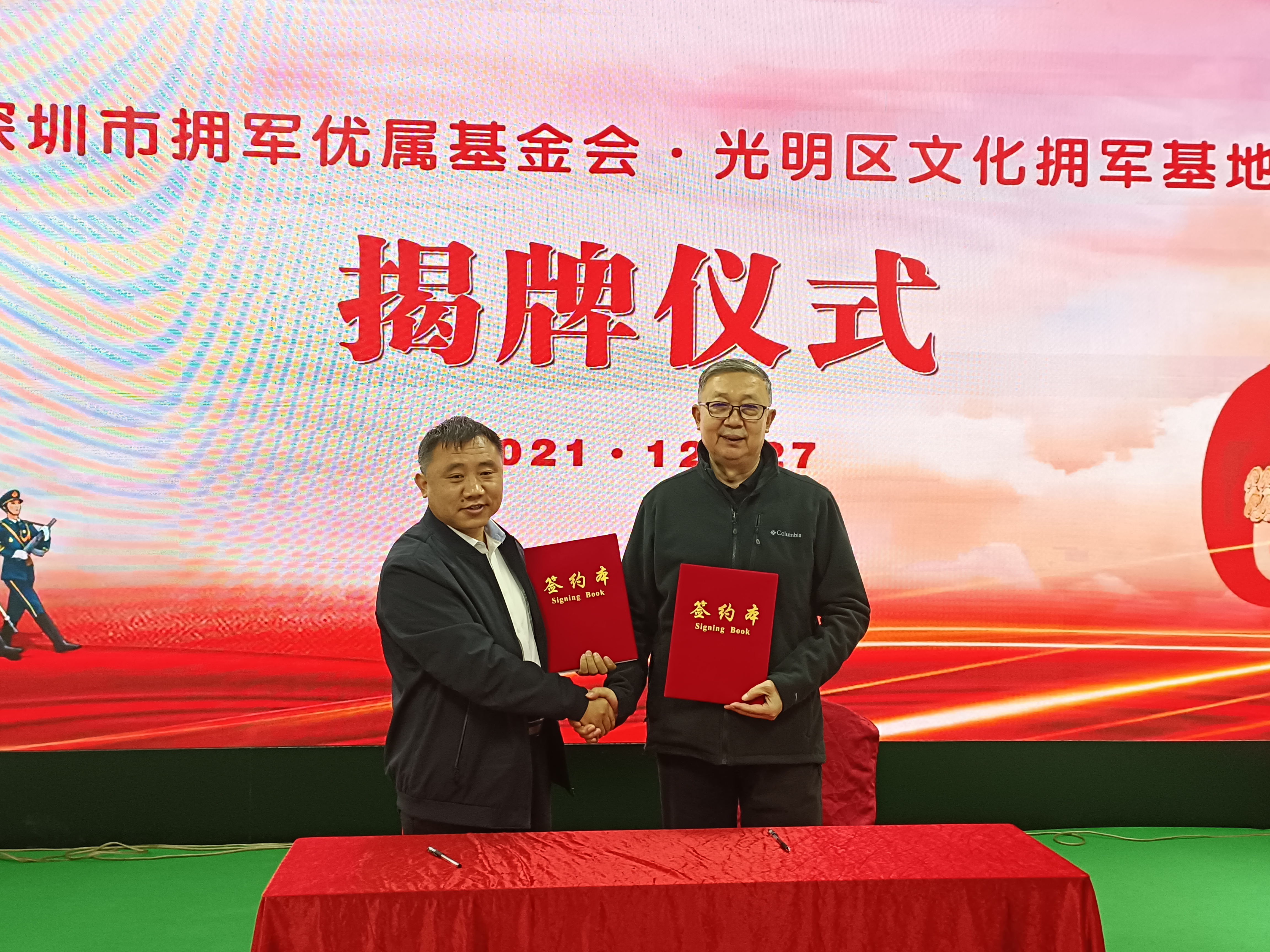12月27日,“深圳市擁軍優屬基金會·光明區文化擁軍基地”簽約揭牌儀式在光明烙畫基地舉行。原深圳市委常委、原深圳警備區司令員、深圳市擁軍優屬基金會理事長劉勇與深圳弘揚烙畫藝術發展有限公司總經理張守福簽訂《“文化擁軍”共建協議書》。