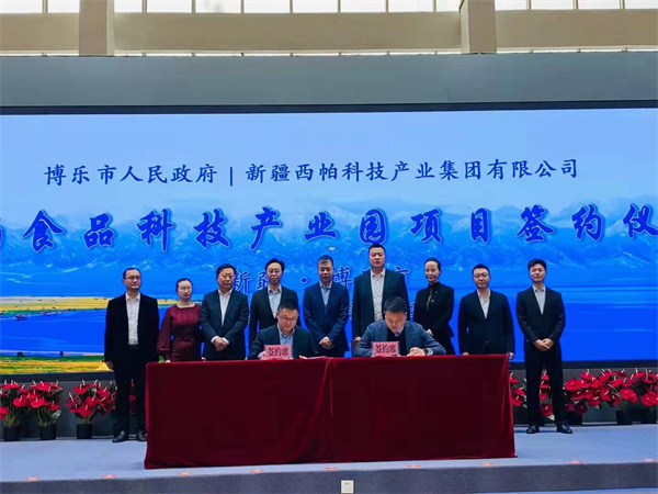 在自治州黨委常委蘇卡,博樂市黨委書記、賽里木湖風景名勝區黨工委書記李海軍,博樂市黨委副書記朱紅兵,博樂市黨委常委馬那提別克,西帕集團董事長許志學,副董事長劉彩霞的見證下, 自治州副州長、湖北援疆工作前方指揮部副總指揮方向榮和西帕集團首席戰略官劉敬文簽署了全面戰略合作協議,博樂市副市長黃連軍和西帕食品總經理李澤簽署了西帕食品科技產業園投資協議。(記者 翁海倩 攝影 哈力·瓦里汗)