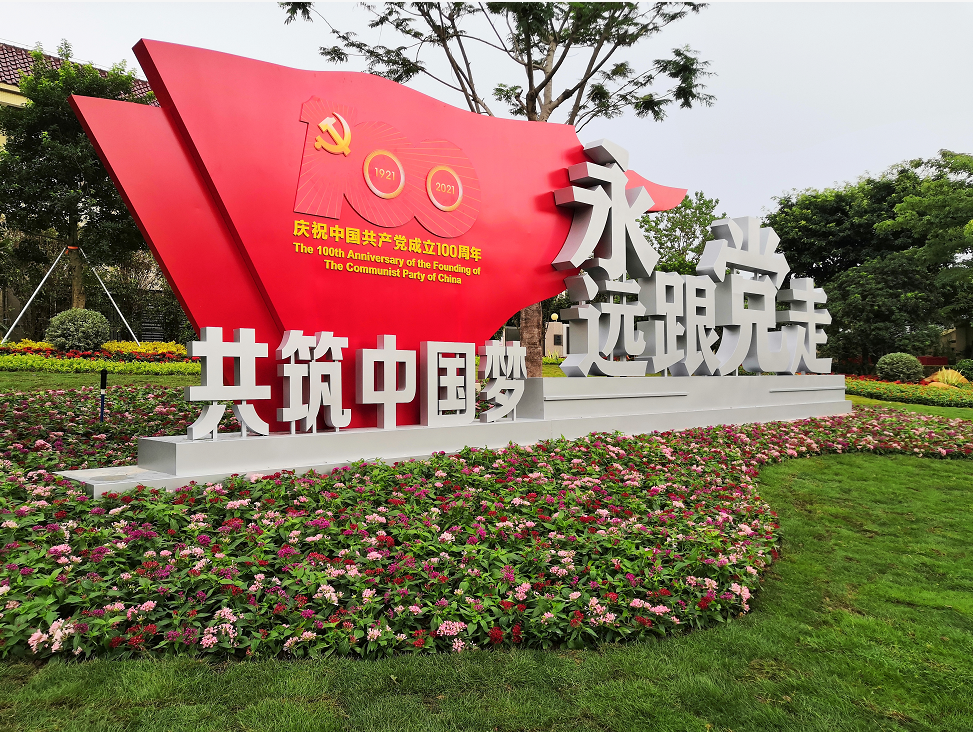 南沙鳳凰大道旁佈置的景觀,慶祝中國共產黨成立100周年氛圍濃厚