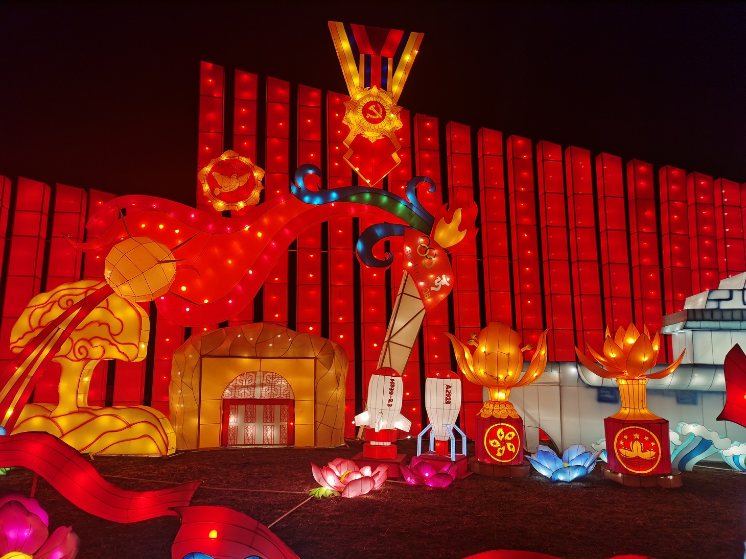 繼續前行,步入本屆燈會主會場——「一起向未來」主題區。場景式主題燈組《百年輝煌》,以恢弘的氣勢展現建黨100周年的風雨歷程;《美好生活》燈組描繪新時代下人民的美好生活場景及對未來科技改變生活的暢想;而結合三星堆文化創新設計的《國粹》燈組,則講述着中華文化悠久輝煌的故事。「請到迎春燈會來」主題歌舞,邀請遊客一同舞動未來。
