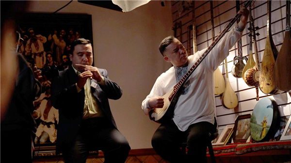 「古絲綢之路上,沙漠里駱駝身上的鈴鐺發出叮咚叮咚的響聲,不僅可以指引方向,還可以消除人們的孤獨,就這樣,新疆獨有的樂器便產生了。」新疆十二木卡姆樂器巴拉曼、彈布爾、艾捷克的樂器演奏再一次將大家帶入了神秘的古絲綢之路。
