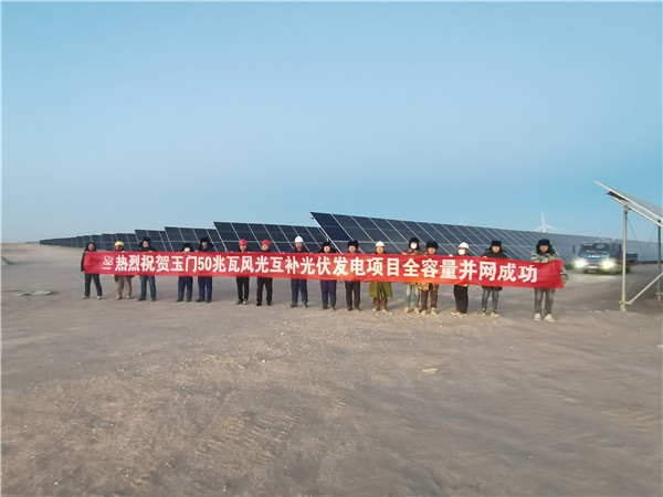 中核玉門昌西50MW風光互補項目自2021年10月16日開工建設以來,中核匯能西北分公司層層壓實責任,按照「深前期、嚴開工、精建設、強運營」工作要求全力推進項目建設,合理安排施工資源,加強疫情防控,安排專人駐廠盯貨。在確保安全的前提下,項目部和全體建設人員主動放棄休假,連續奮戰,克服疫情、嚴寒天氣、設備供貨緊張、施工協調難度大等諸多困難,僅用75天就完成全部工程量並投產發電,實現當年開工、當年全投的目標,用「中核速度」繪就了新能源項目建設的「戈壁風光」。