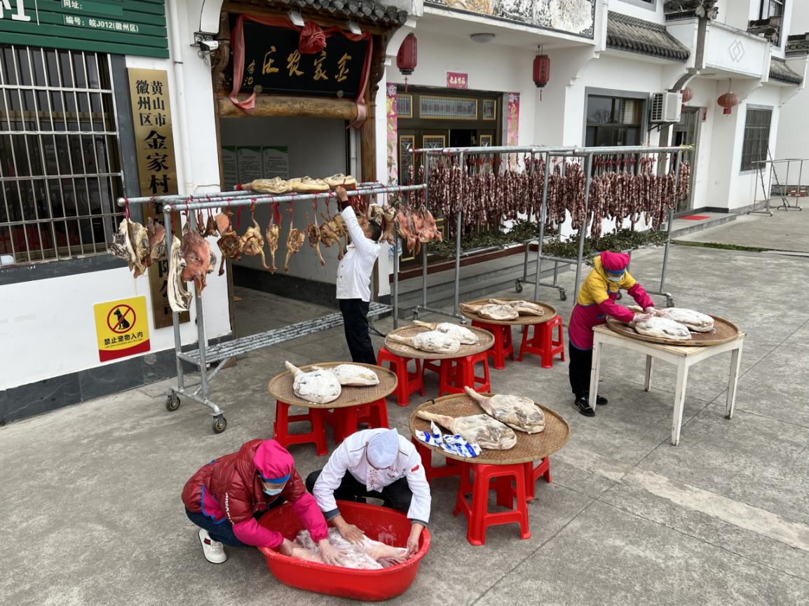 冬至後,位於徽州區西溪南鎮東紅村的金家農莊迎來了一年中最繁忙的銷售旺季,全家忙著醃制並晾曬徽州火腿、刀板香、香腸等年貨,色澤紅潤、油光發亮的臘肉掛滿院子,成為徽州冬日裏獨特風景。