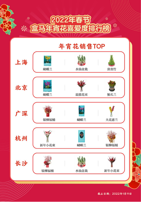 盒馬平台顯示,自從春節年宵花上市以來,各類年宵鮮切花、盆栽的銷量環比上月漲幅超過65%。而不同城市的消費者對年宵花也「各有所愛」,在北京、上海,攜帶方便的蝴蝶蘭禮盒成為當仁不讓的年宵花「王者」;在廣州、深圳,喜慶而且花期更高的銀柳福桶最受「老廣」的喜愛;在年輕消費者佔據買花主力軍的杭州和長沙,時尚的鮮切花束則更受歡迎。