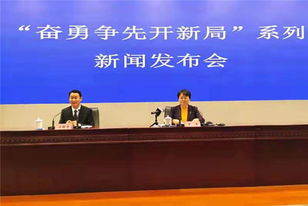「奮勇爭先開新局」系列新聞發佈會(第三場):奮力打造具有重要影響力科技創新策源地新聞發佈會,安徽省委宣傳部新聞發佈處處長汪曄宇(左)主持發佈會,省科技廳廳長羅平介紹有關情況(孫軍/攝)