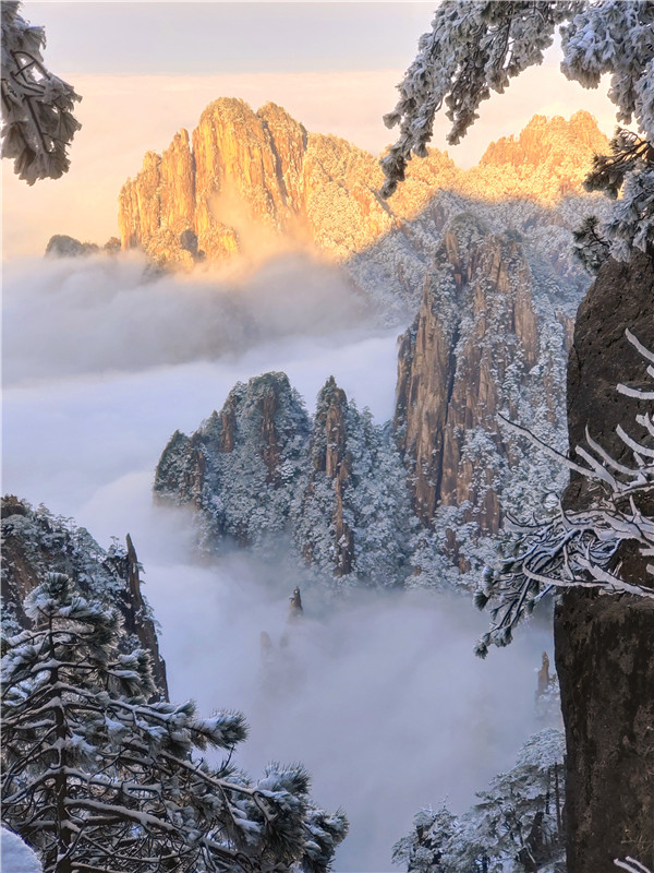 早上七時,一輪紅日在天際冉冉升起,放出萬丈光芒,遠處的雲海都像被鑲上了金邊,如油畫般美輪美奐。在陽光的照耀下,山峰、奇松也散發著金燦燦的光,給雪白的冬季帶來神奇的色彩。