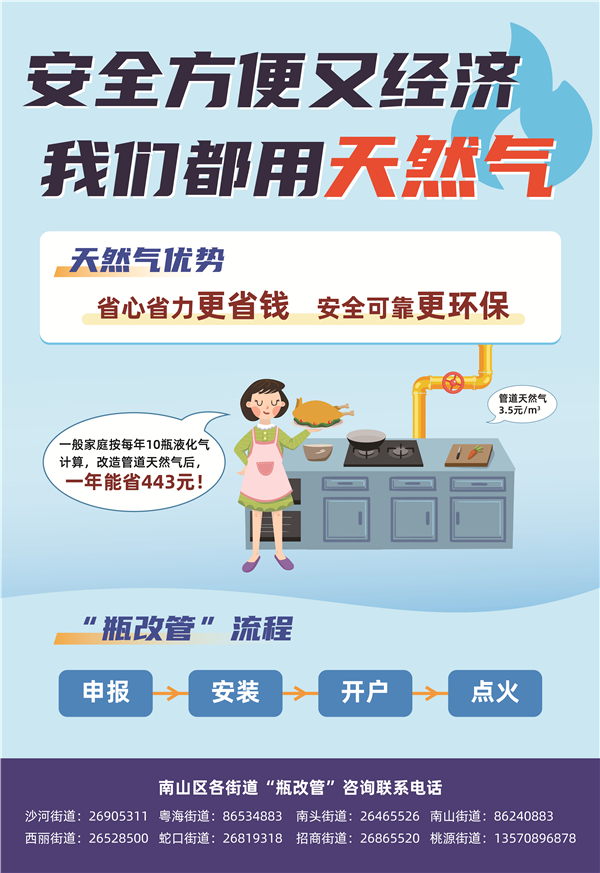 1月10日,《南山區全面實施「瓶改管」工作方案》正式印發,標誌着深圳市南山區「瓶改管」工作全面啟動。符合「瓶改管」條件的居民和業主,只需要「四步」就可以輕鬆和煤氣瓶說「拜拜」。