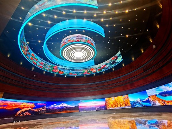 走進大廳,瞬間就被眼前和頭上一圈圈超大的LED屏所震撼。大廳上方共配備三層環形柔性屏,相互環繞、錯落有致,給人以視覺衝擊。其總面積達250㎡,相當於3個羽毛球場大,與大廳高2.4米,長40米,面積接近100㎡的弧形高清LED屏幕相互輝映,形成科技感滿滿的現代會議應用場景,給人以沉浸式的視覺體驗。