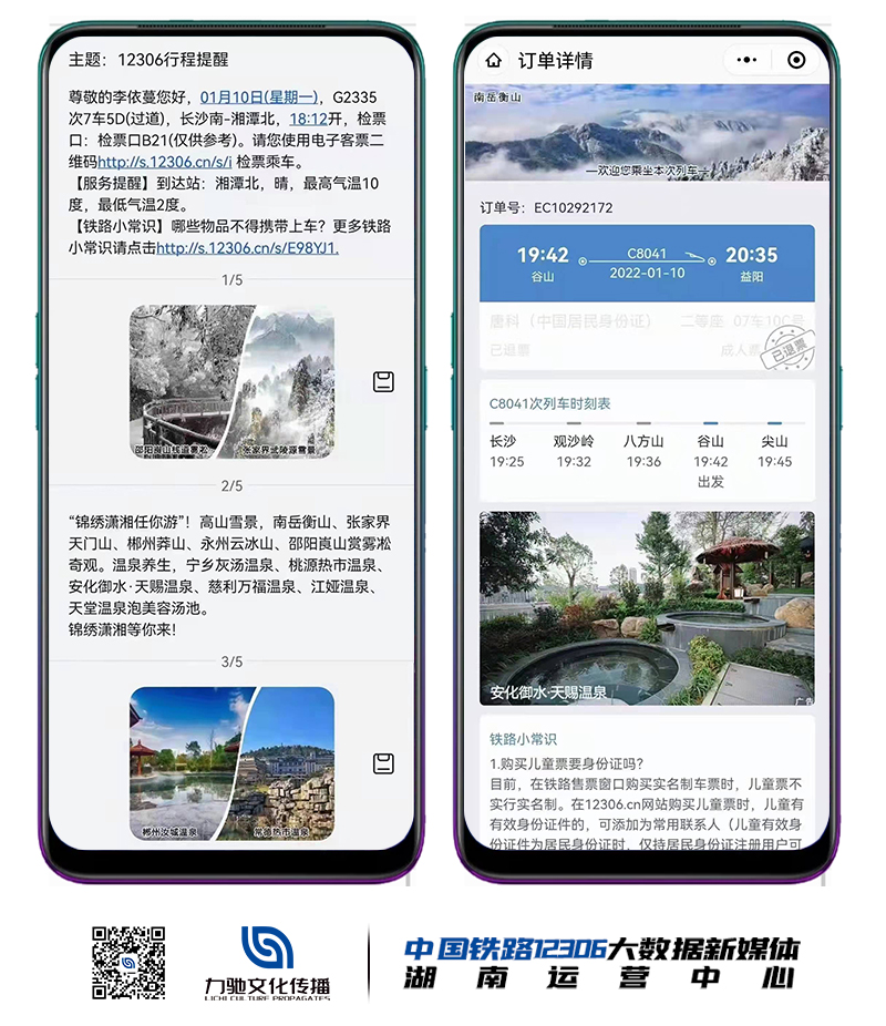 從今年1月開始,遊客驚喜發現,在線上購買從長沙出發到達湖南省地市的高鐵車票後,12306在推送行程信息的同時,還為旅客推薦了湖南冬季出遊打卡地。