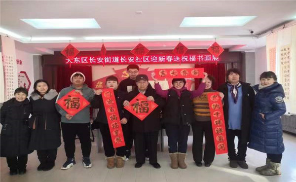 為豐富居民文化生活,弘揚中華傳統文化,構建文明和諧社區,瀋陽市大東區長安街道長安社區近日開展「新春送福」書畫展。活動邀請了省、市書法家協會會員臧立君、臧蘊波以及書法愛好者孫莉老師給社區居民題字送「福」。