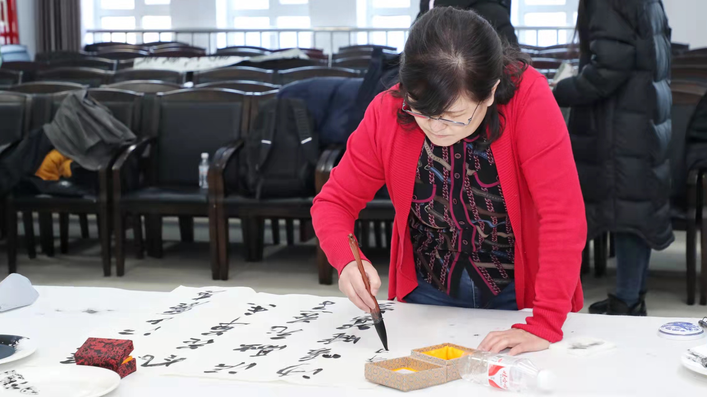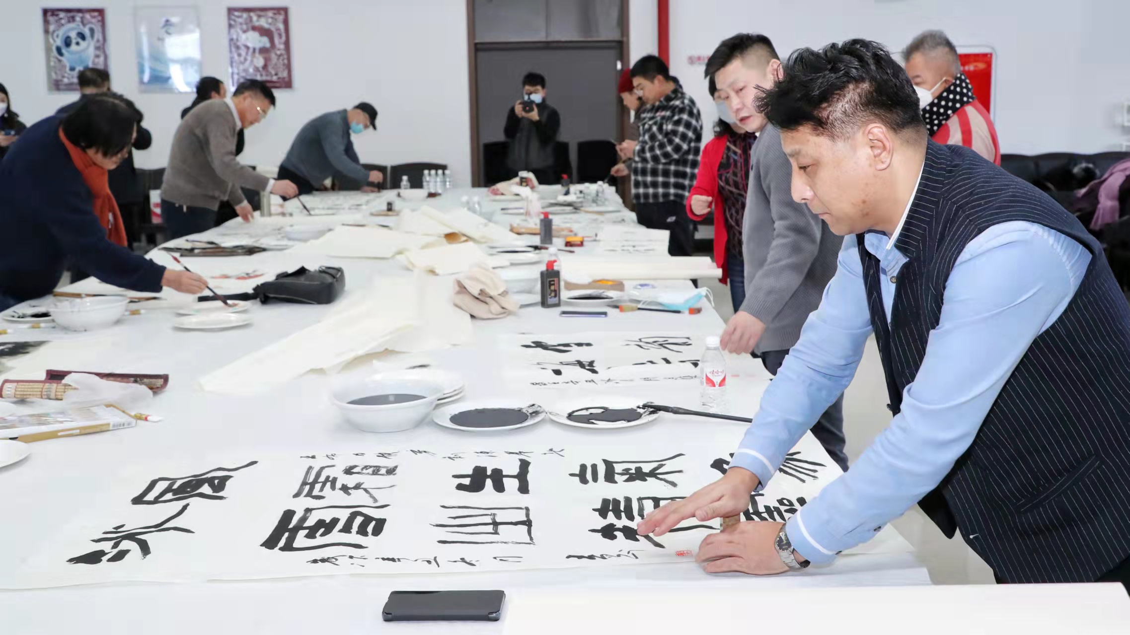 在筆會現場,11位書畫家揮毫潑墨、筆走龍蛇,一個半小時的時間便創作出30餘幅丹青墨寶贈予省體育局和亞布力體育訓練基地。這些作品以助力北京奧運、勉勵龍江冰雪健兒、弘揚體育精神和冰雪文化,以及讚美亞布力的冬景與雪韻為主題。