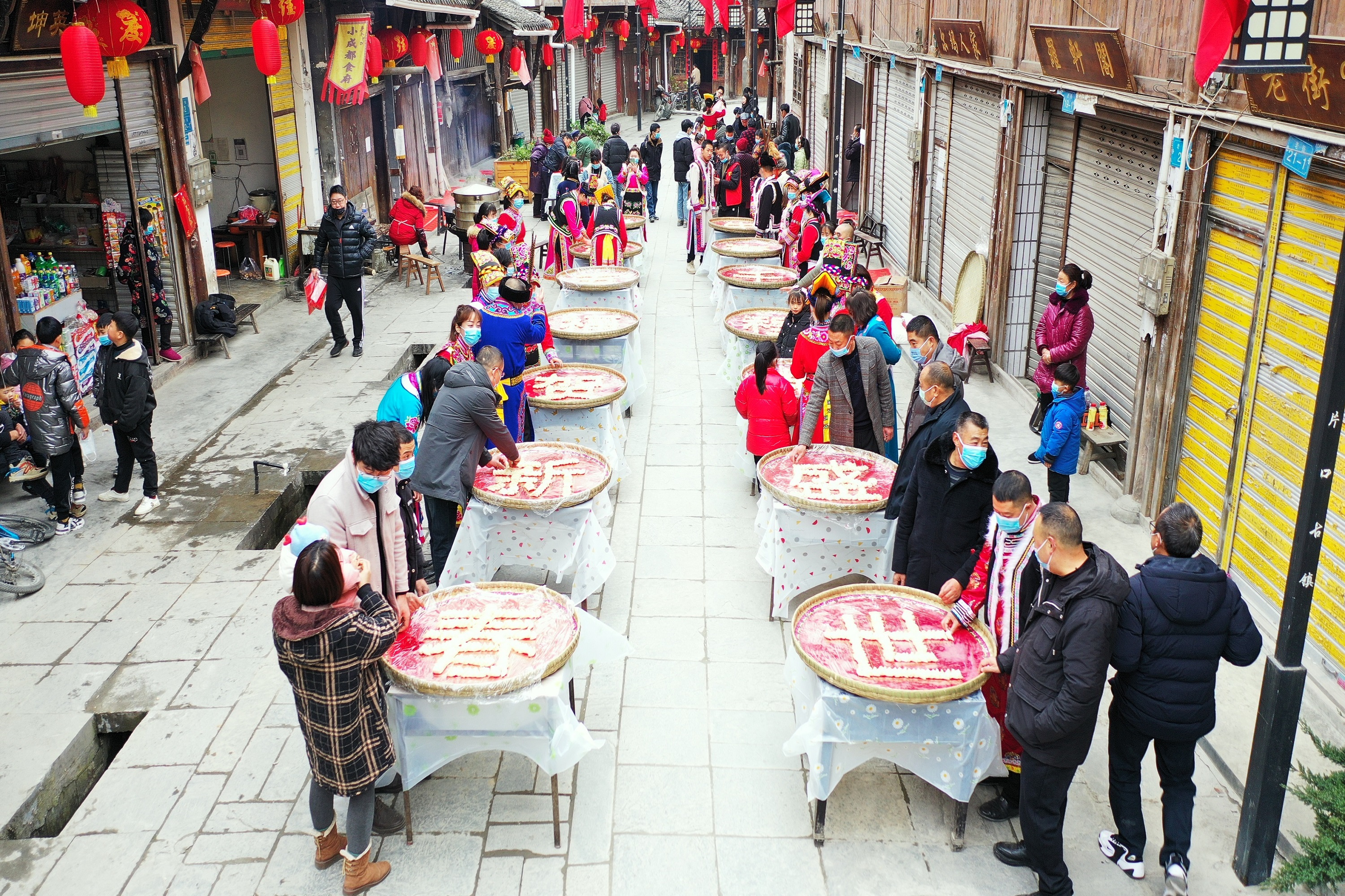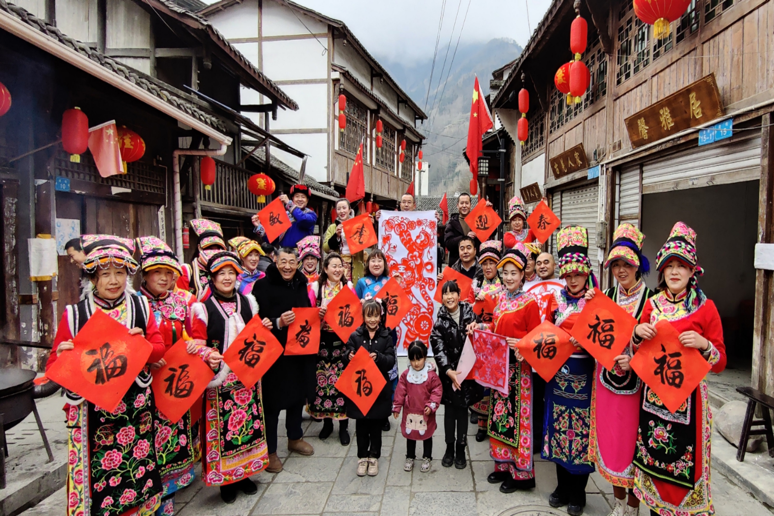 大紅的燈籠、飄揚的國旗,盡顯年味。藏、羌、漢三個民族的老百姓穿着民族服裝,用當地豐收的白菜和自家養殖的土山豬肉作餡兒料,舉辦千人餃子宴。和面拌餡兒、擀餃子皮、包餃子,大家互相配合、分工有序,忙得不亦樂乎。經過兩個多小時的努力,2022個豬肉白菜餡餃子全部包好,被拼成「牛奮千程榮盛世 虎馱五福賀新春」字樣的對聯。歡聲笑語中,一盤盤白白胖胖的餃子被倒進了鍋,隨着沸騰的熱水,餃子的香氣也逐漸蔓延開來。飯桌上,藏、羌、漢三個民族的老百姓一邊談笑風生,一邊吃餃子,吃出了新年新氣象,吃出了民族團結一家親。「共產黨帶領我們發揚艱苦奮鬥老黃牛的精神,讓我們過上了小康生活。餃子象徵着包住好運氣,好福氣,今天我們藏、羌、漢三個民族的同胞齊聚在這裏包餃子、寫春聯、吃餃子,就是希望來年的日子過得紅紅火火,吉祥如意。」片口鄉松柏村村民唐方蓉說。