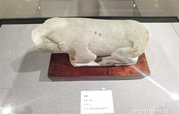 “虎虎生福”展覽中,深圳市金石藝術博物館的“元代石臥虎”精品文物被重點展陳。這件圓雕漢白玉石虎呈臥姿,虎軀修長渾圓,微微揚首,雙目圓睜,虎嘴緊抿,左右各露一顆虎牙,齒尖向下,兩耳自然貼於頭部兩側,似作聆聽狀。鼻子與眉額之間巧妙地線面連接,令面部線條簡潔洗練生動異常。虎臀圓潤,微微翹起,虎尾順勢盤至後腿下。石虎通體完好,打磨精細,幾處自然沁色,更顯溫潤自然,整體造型憨態可掬,為元朝經典之作,在反映古代石刻藝術水準的同時,其古拙、平和姿態中透露的威嚴,生動體現了元代人對虎的文化審美意趣。