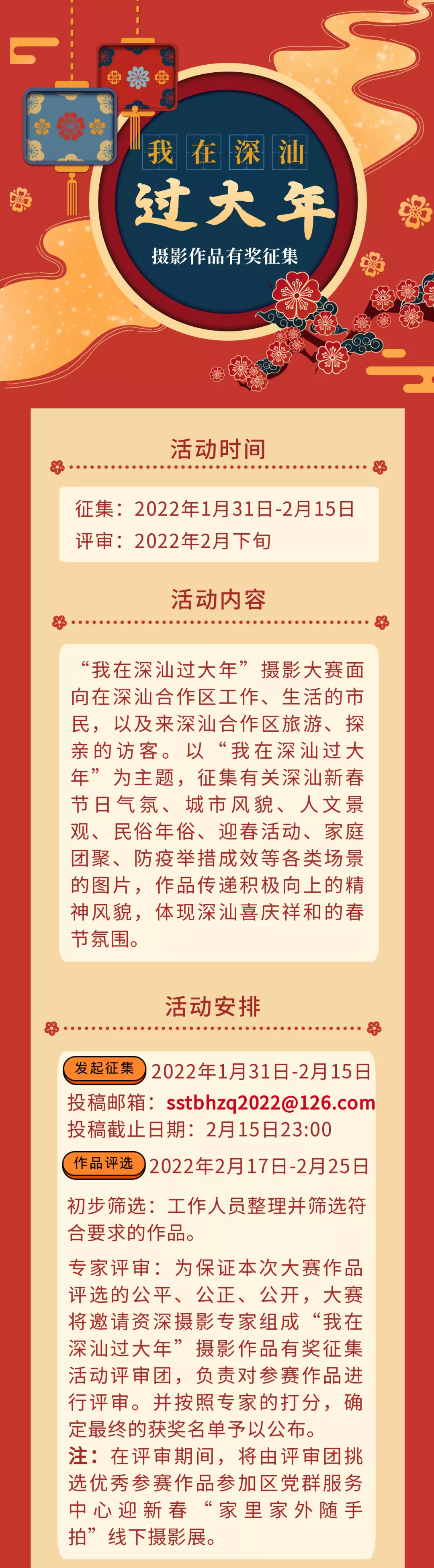 據悉,該活動將設置47個獎勵名額,最高獎勵3000元。徵集2022年春節期間,人民群眾在深汕特別合作區歡度佳節的照片,以圖片的形式記錄深汕居民過年期間的生活場景,充分展現大家響應號召積極向上的生活態度,定格深汕的風光之美、人文之韻、節慶之樂。
